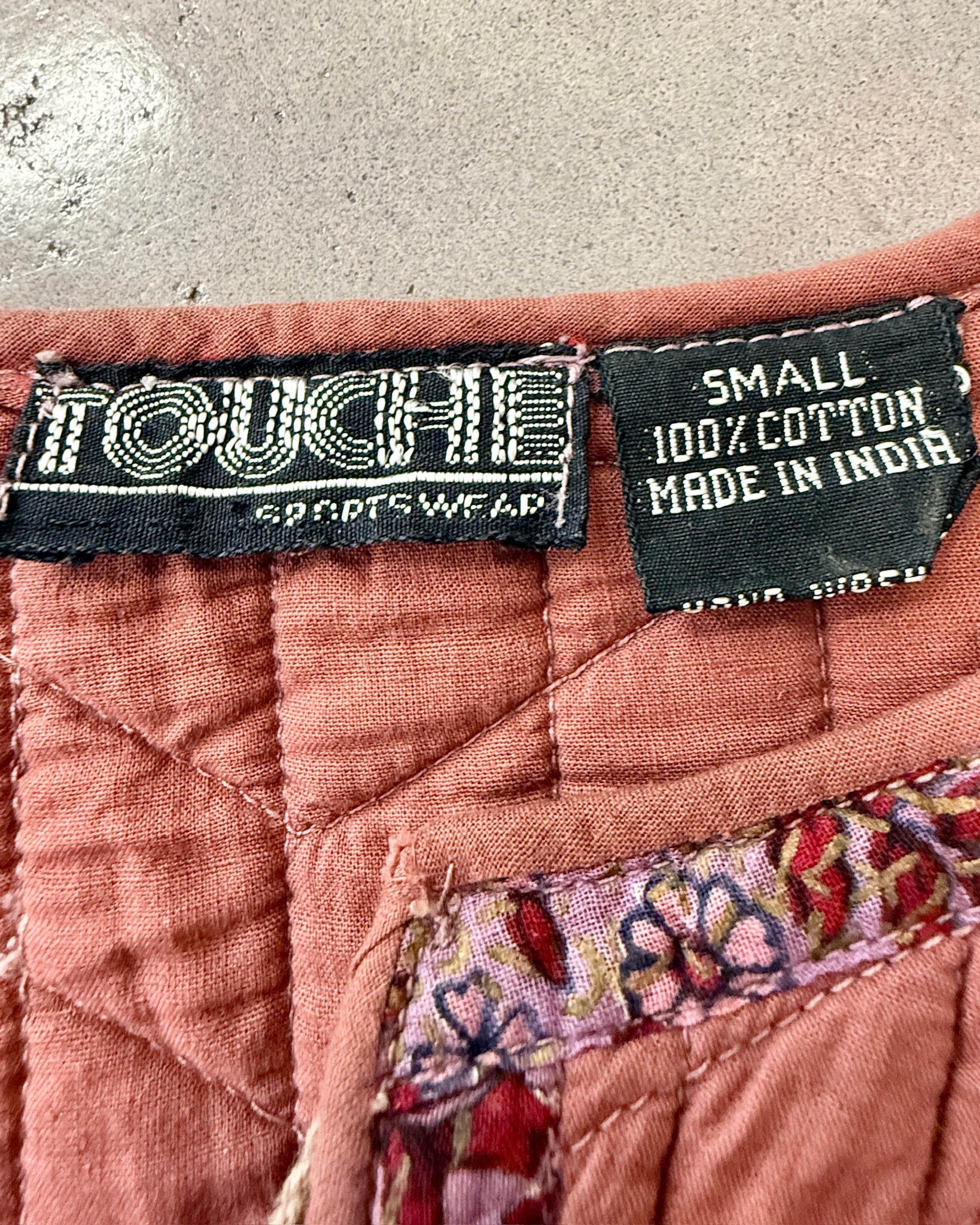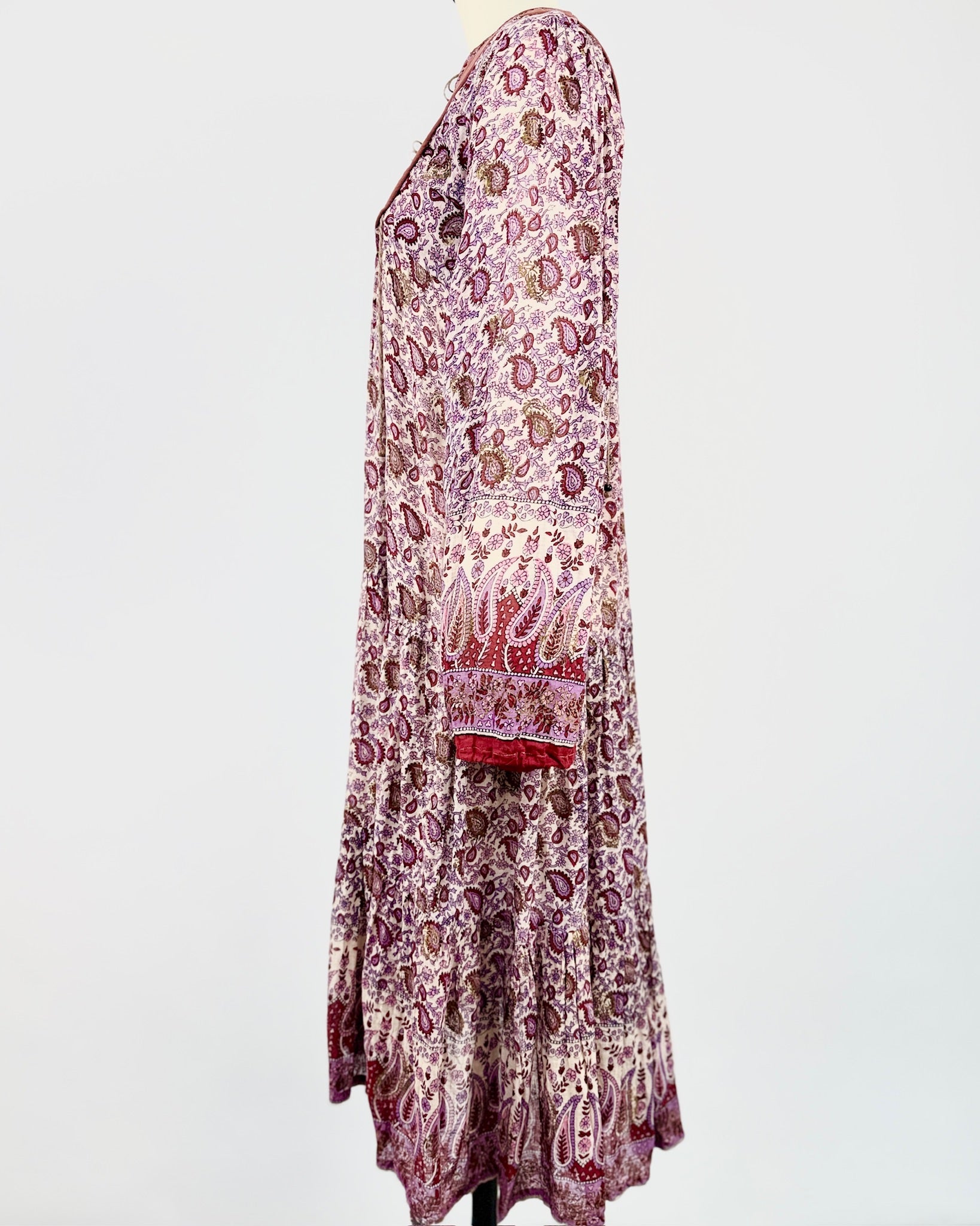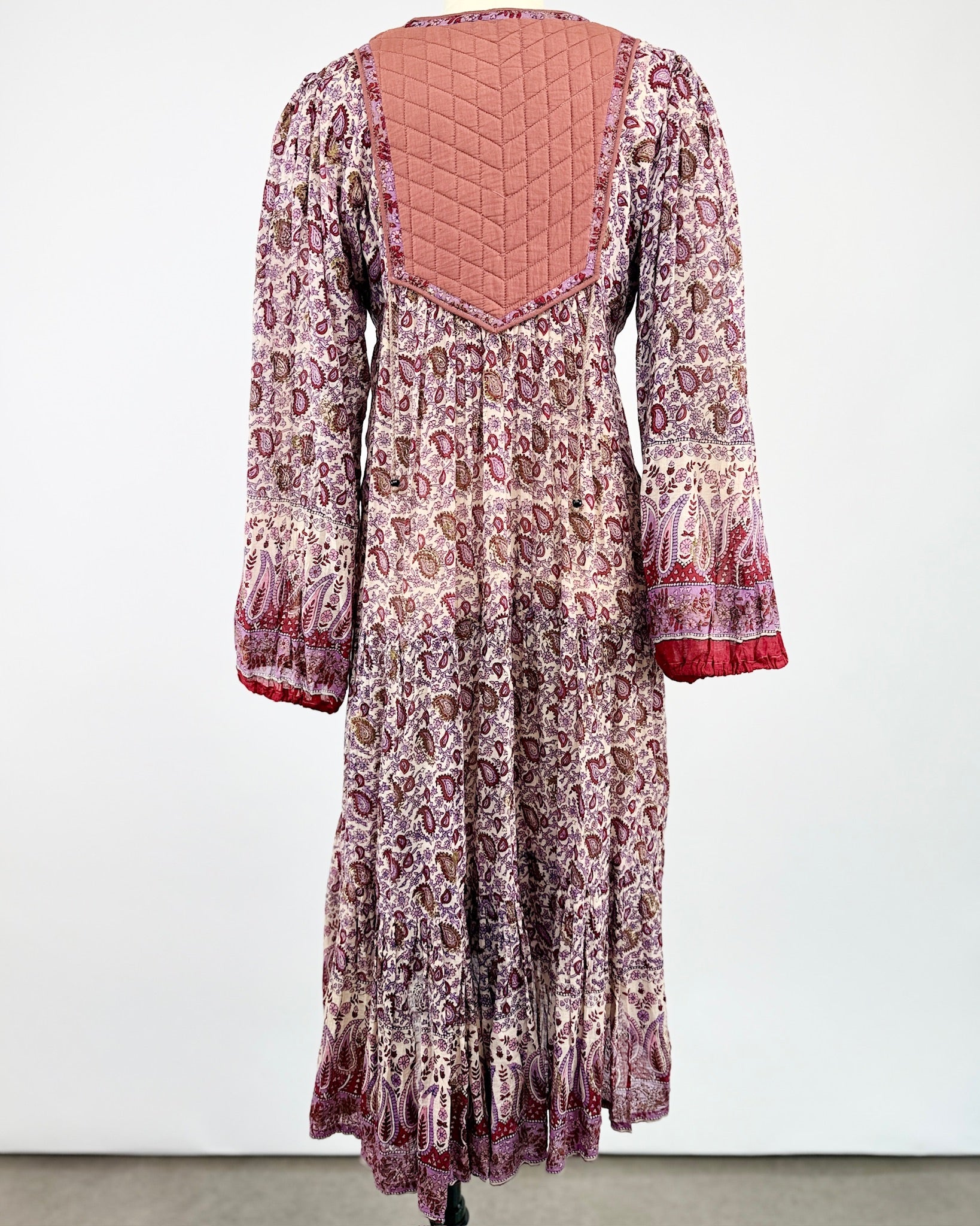 Beautiful gauzy sundress with purple floral print and contrasting quilted bib in a terracotta tone. Features double tie neckline and a flowing silhouette.