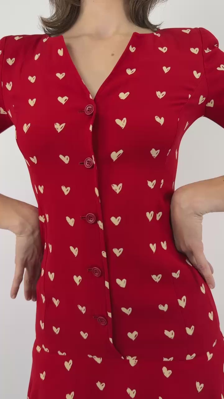 Cherry red drop waist mini dress with adorable white hand-drawn heart print throughout. Features a collarless neckline and buttons down the front.