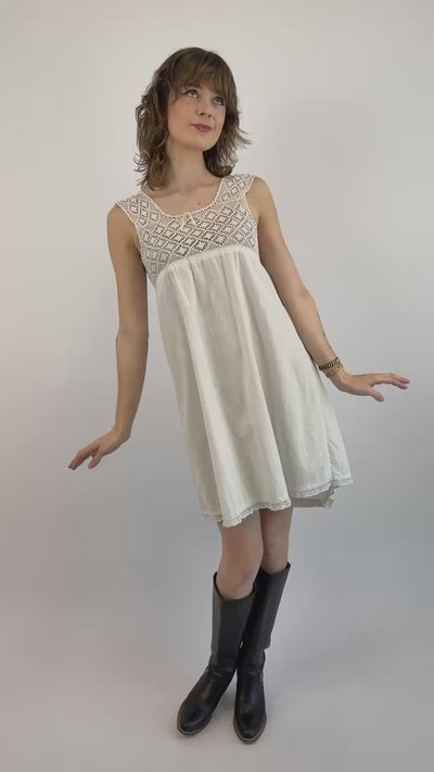 Darling Edwardian white cotton mini dress featuring a crochet neckline which pattern resembles sweet diamonds of sugar. Style with colorful accessories or light and romantic with a silk headscarf and scandals.