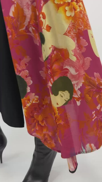 Elegant black asymmetrical maxi skirt with fuchsia and orange blossom chiffon accent panel on the right side, featuring a portrait-style print throughout.