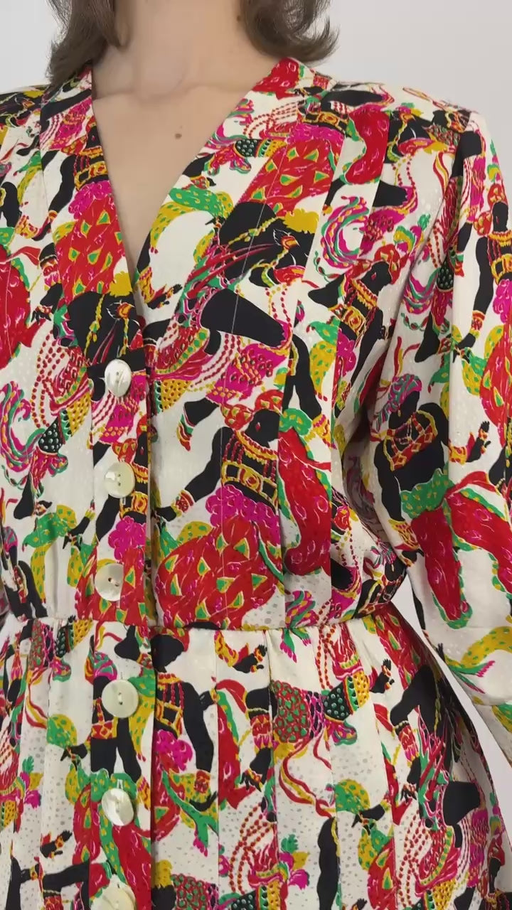 Incredible 1991 Yves Saint Laurent silk secretary dress featuring a vibrant print by artist Leon Bakst, detailed with padding at the shoulders, buttons at the front and a pleated skirt.