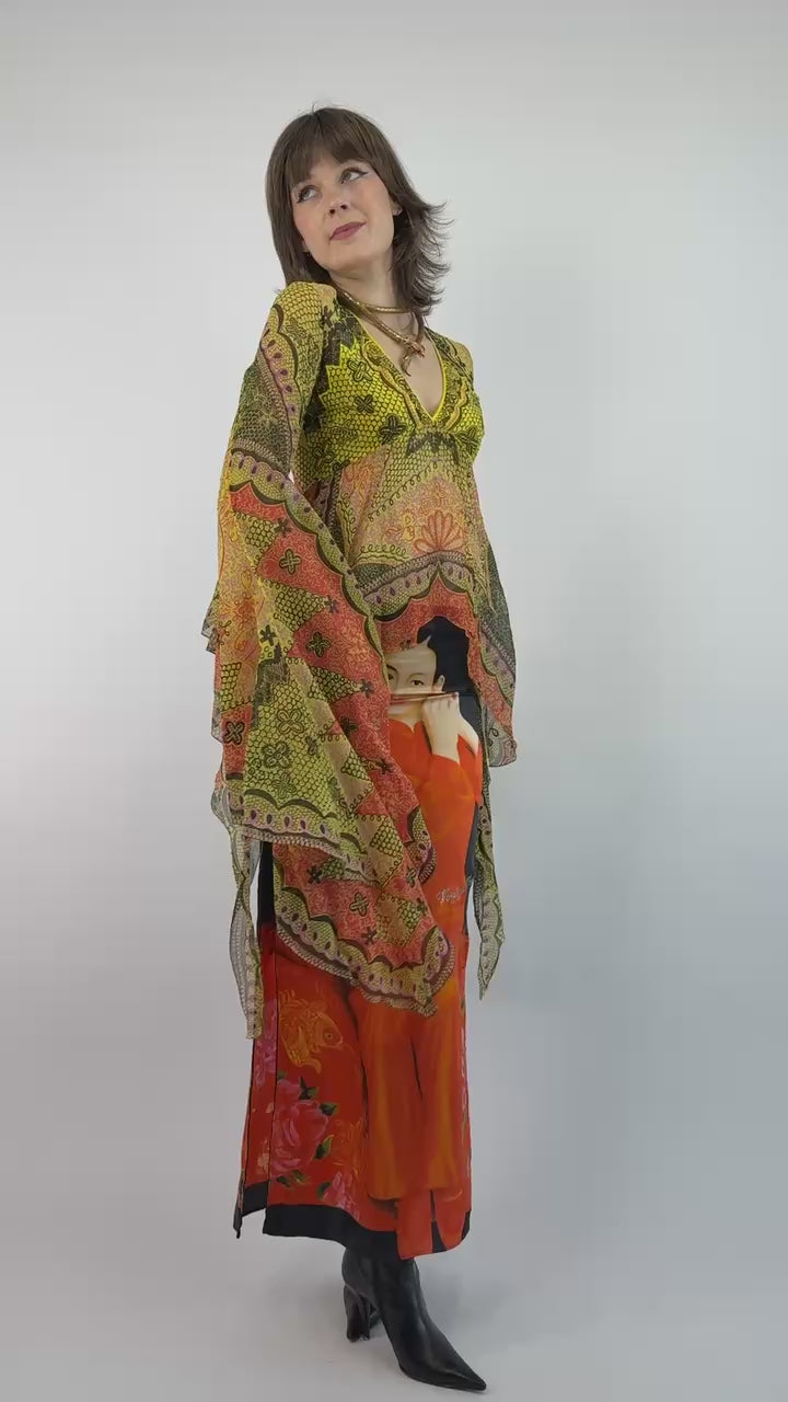 Yellow-and-orange chiffon Zandra Rhodes blouse, where exaggerated cascading sleeves float effortlessly and a playful swirling print makes its way throughout the piece.
